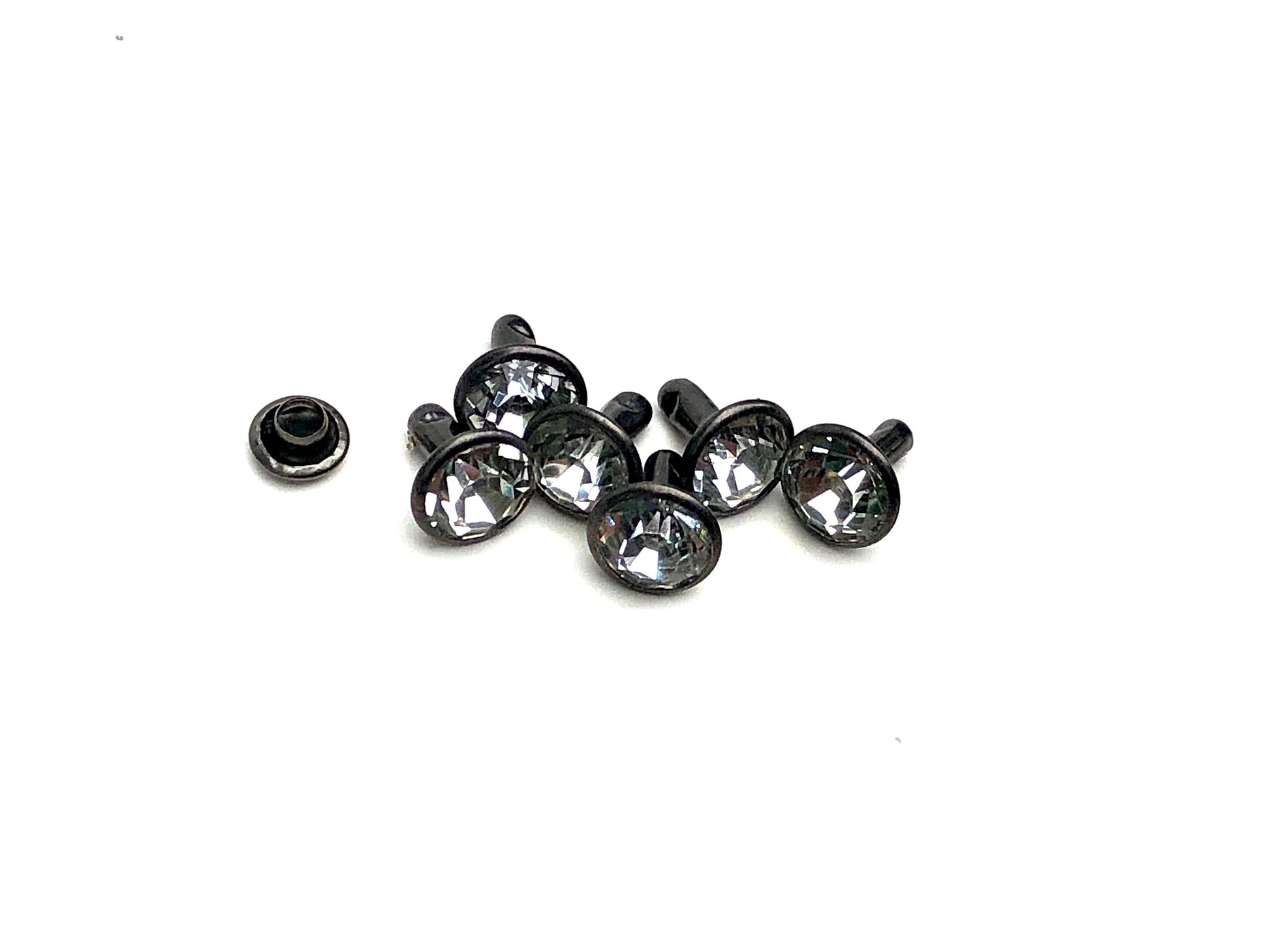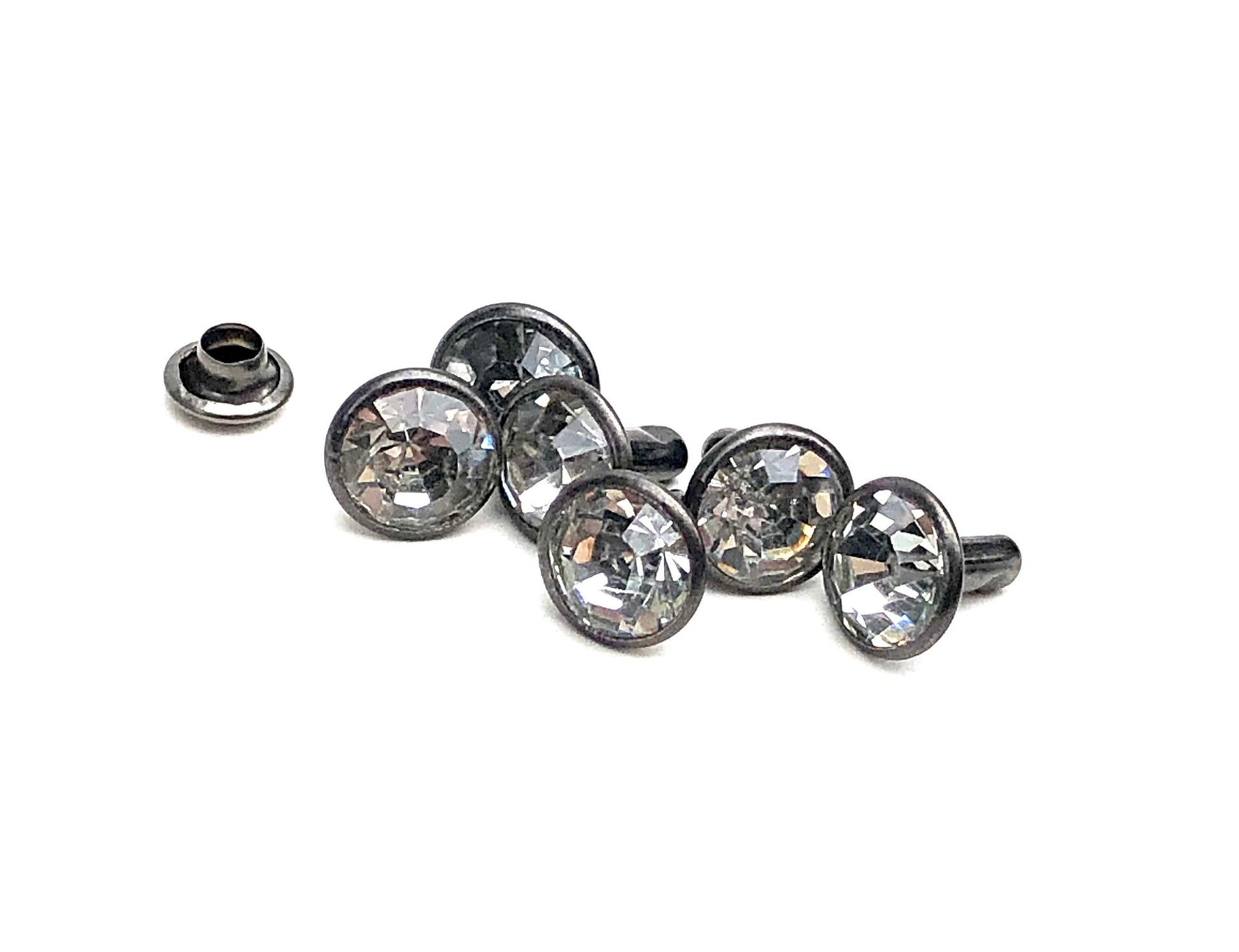 All new beautiful premium glass crystal rivets in Gunmetal setting. Available in 20, 50, and 100ct packs. Crystal size is 8mm diameter with 5mm post and 6mm cap.