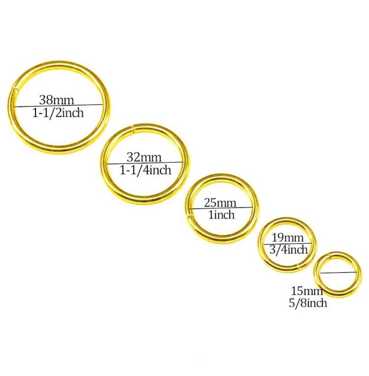 10ct non-welded Metal O rings in silver or gold finish available in the following sizes: 1/2”, 5/8”, 3/4”, 1”, 1-1/4”, and 1-1/2”.