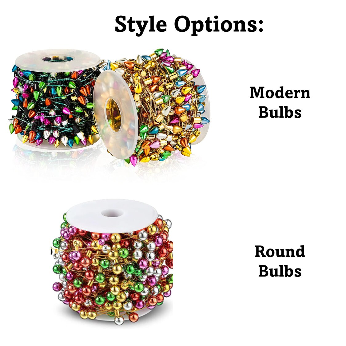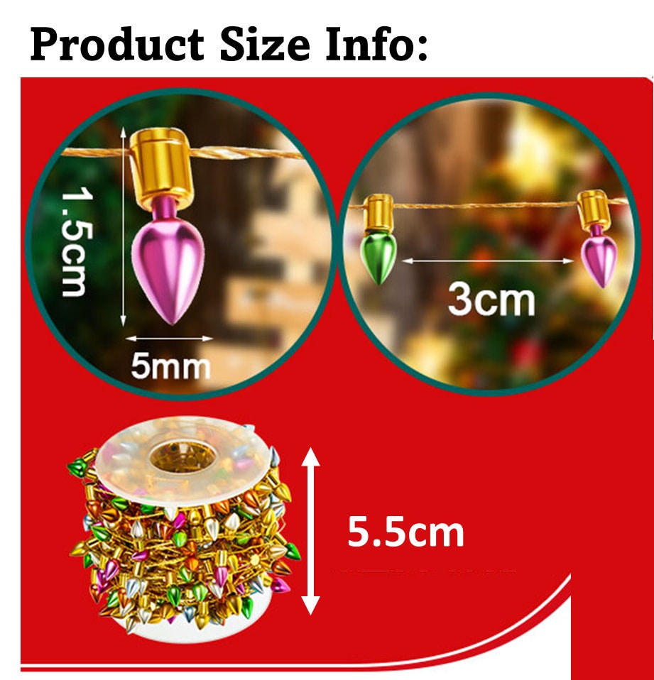 Miniature Imitation Christmas Lights perfect for Christmas Villages, Doll houses, Jewelry making, Gift Wrapping décor, Snow globes, Christmas Decor, Wreaths, Crafts, and more. Available in 10ft and 20ft spools with choice on modern or round shape bulbs. Note the bulbs are not actually electric (see photos) they are made with a metallic paint that makes them appear to be real. String can be cut to length desired.