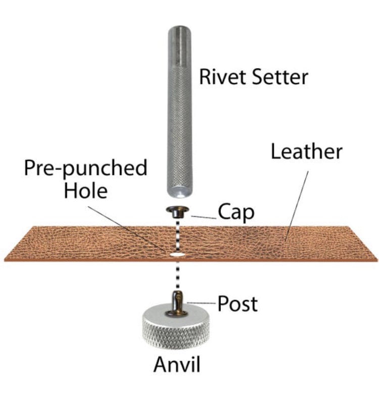 A double cap rivet has a smooth cap at both ends of the rivet. This is often preferred for items where both ends of the rivet will be in contact (i.e. bracelets, garments, shoes, armor, etc). They can be set by punching a hole in the leather and using a rivet setting tool (by hand) or press machine to set the rivet. Used for both decoration and function in holding pieces together it is commonly used as a substitute for sewing, offering both mechanical strength and decor.