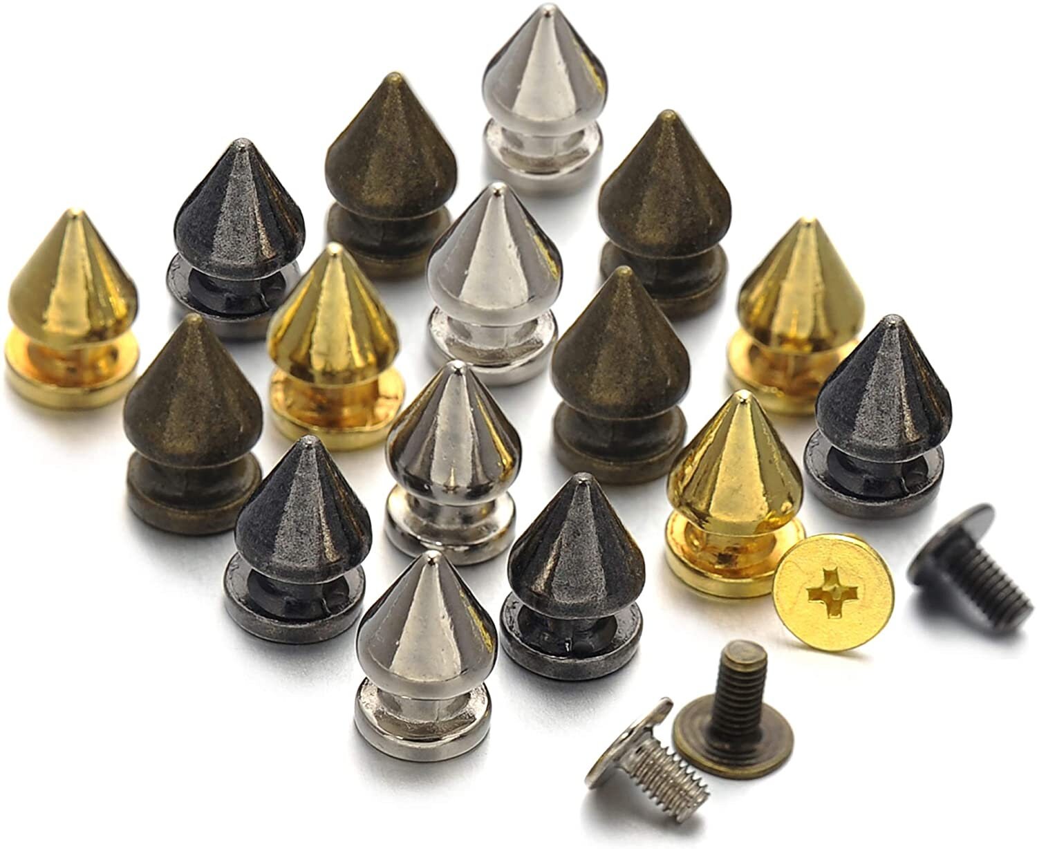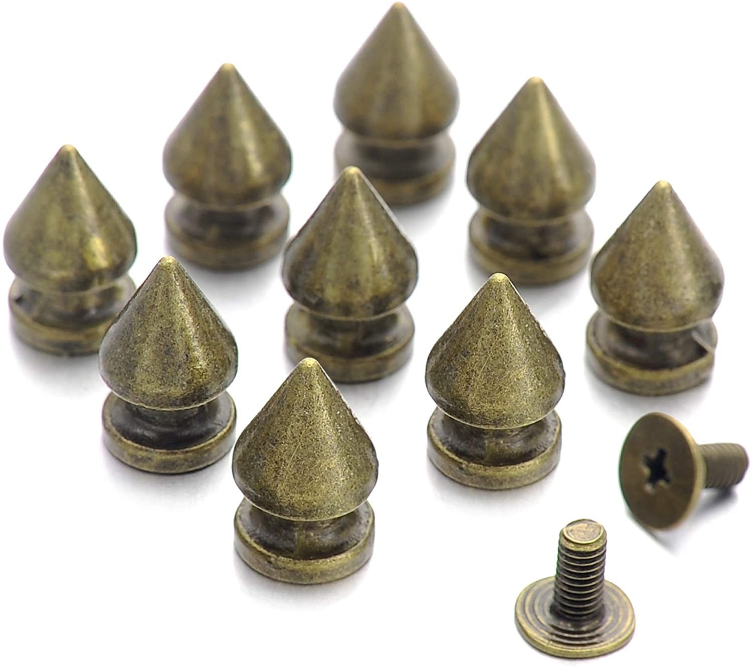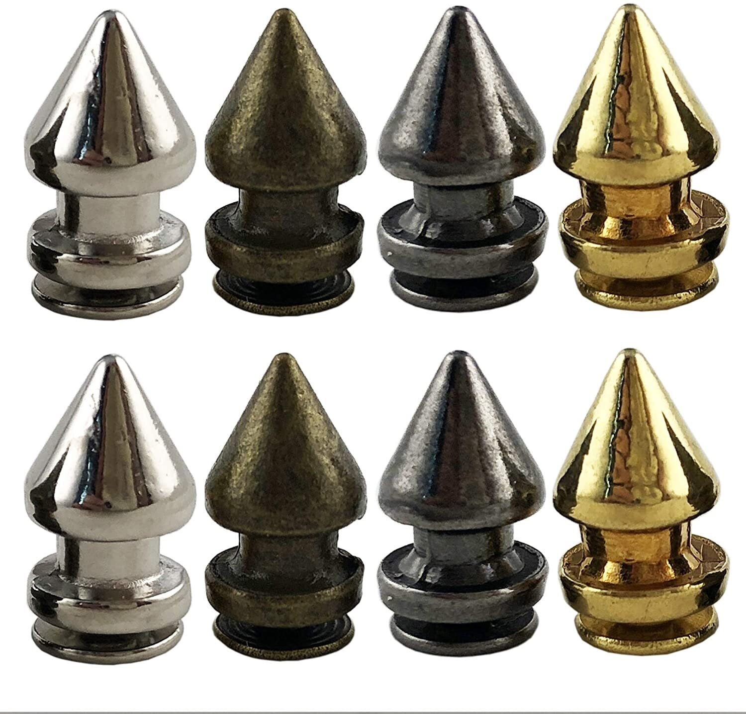 Screw on Spike rivets in 20ct packs. Silver, Gold, Gunmetal, and Bronze finish options. See listing photo for full measurements. These rivets attach via a screw included in the pack. Easy to install! We recommend using a dab of Loc-tite for permanent installation, found at your local hardware store or online.