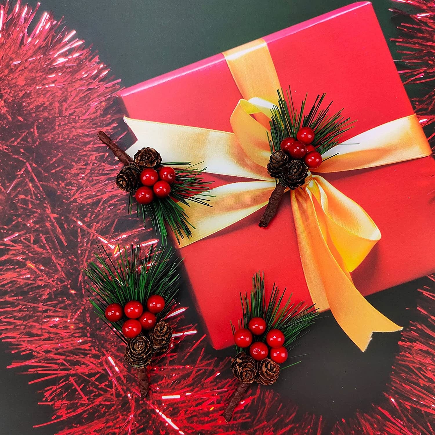 Stems of pine boughs with berries and pinecones. Pricing is per stem. Each steam measures approximately 3.5” long and 2.5" wide. Great for present toppers, wreaths, and decor.